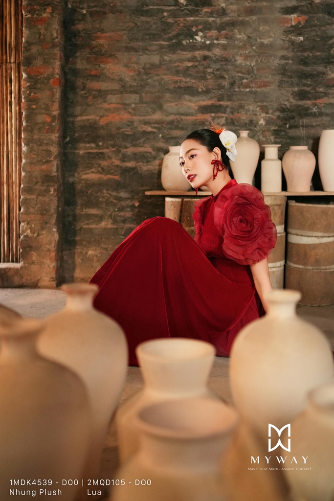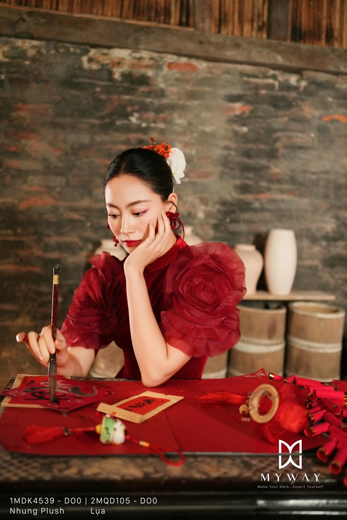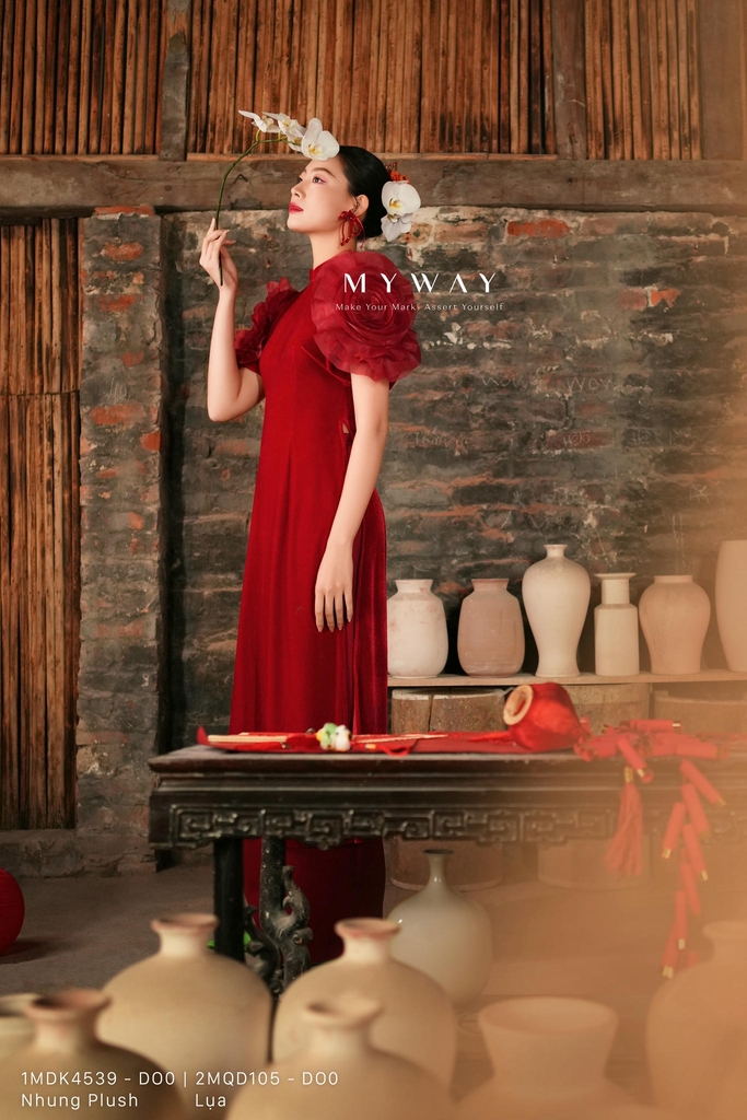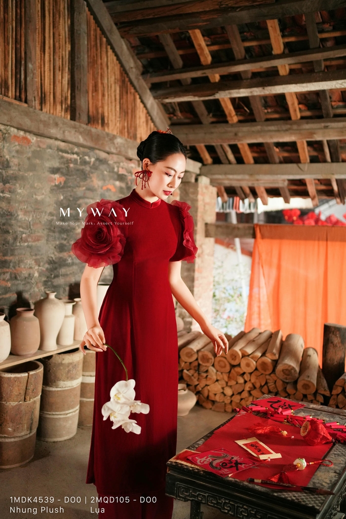 Áo dài cách tân dài trên mắt cá chân, kiểu dáng cơ bản, cổ tàu. Tinh tế cùng chi tiết hoa 3D bản lớn xếp cánh tỉ mỉ giúp phần tay tạo trở nên ấn tượng. Kết hợp chi tiết chiết eo thanh thoát giúp cân chỉnh vóc dáng thời thượng. Thiết kế có độ óng nhẹ từ chất liệu Nhung Plush và gam màu đỏ rực rỡ mang lại sự thoải mái cho thượng khách, toát lên vẻ lịch sự, phong cách hiện đại, sang trọng, khả năng phối đồ cao.