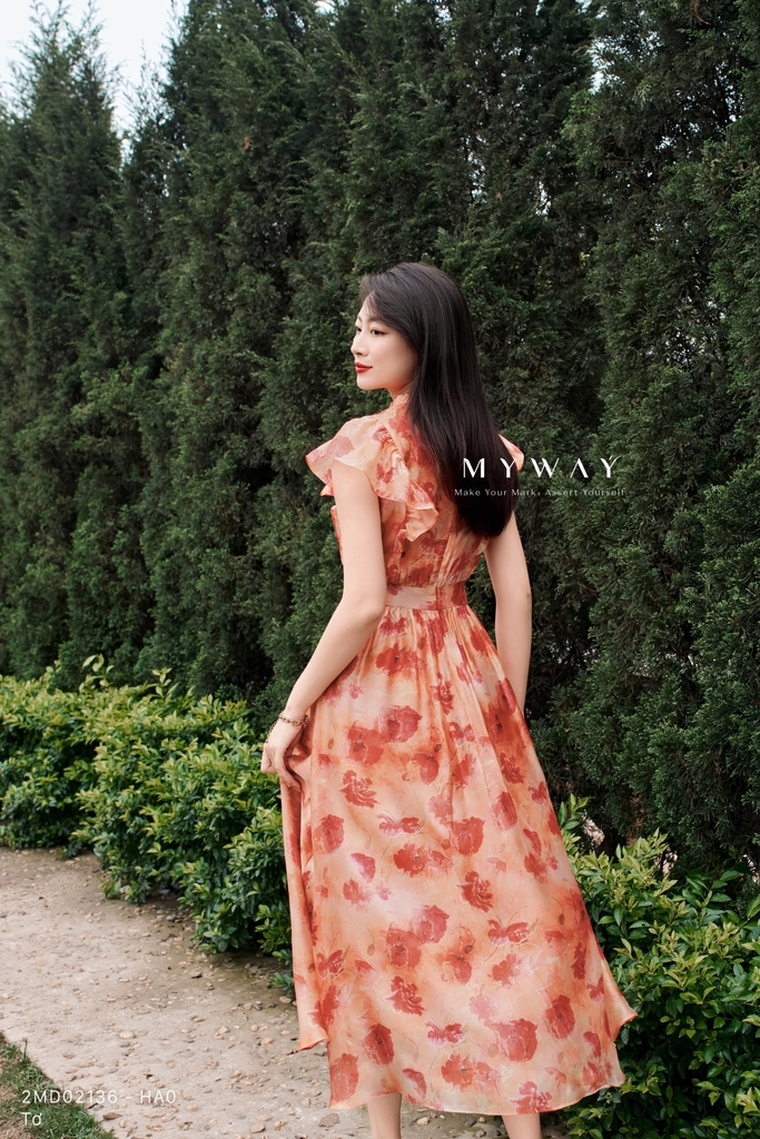 Đầm xòe cổ bèo cách điệu dài qua bắp. Tinh tế cùng kiểu dáng tay bèo cánh tiên thanh lịch cùng họa tiết hoa cam tươi tắn mang lại cảm giác hiện đại, trẻ trung. Đầm Xòe midi sở hữu sắc cam rạng rỡ, thiết kế ứng dụng cao phù hợp mọi hoạt động trong ngày.