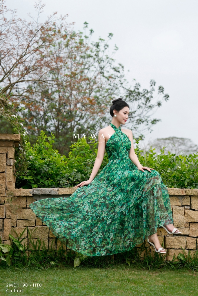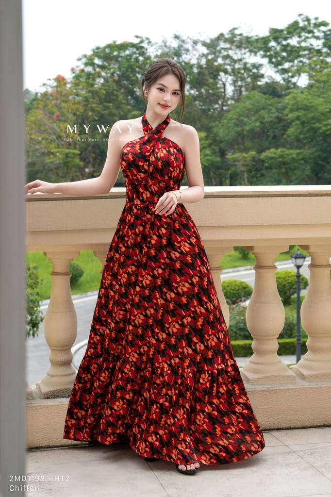 Thiết kế đầm maxi xòe rủ, dài qua cá chân, có lót. Tinh tế cùng thiết kế cổ biến kiểu cách điệu thắt dây quyến rũ, thời thượng, dáng chiết eo giúp vòng 2 nhỏ gọn thanh mảnh. Họa tiết hoa cỏ tự nhiên in trên vải tạo điểm nhấn cho người mặc.