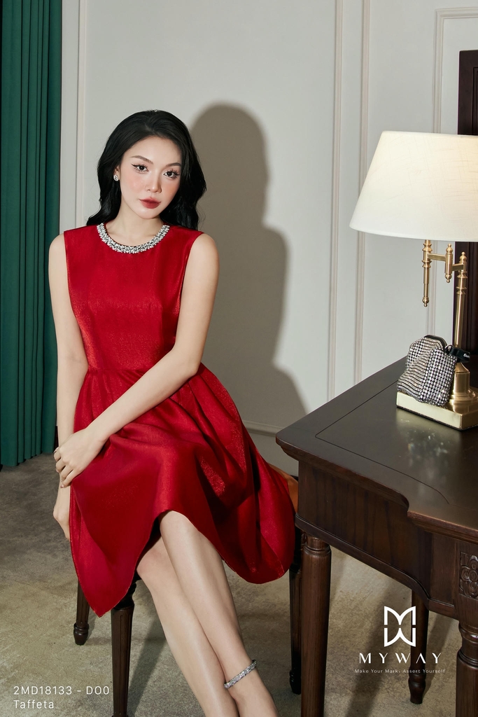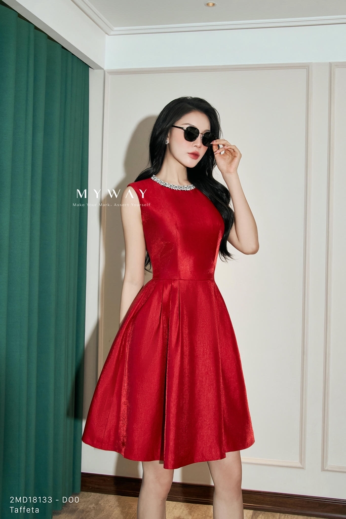 Đầm xoè rủ dáng A-line, cổ tròn, chiều dài trên gối. Mẫu đầm tiệc với tông đỏ ấn tượng, thiết kế có túi, có lót cùng chất liệu Taffeta Soft Lining nhập khẩu cao cấp, giữ phom chuẩn chỉnh. Tinh tế cùng chi tiết đính ngọc quanh viền cổ và dáng trên ôm dưới xoè rủ khéo léo che khuyết điểm vòng 2 cho người mặc.