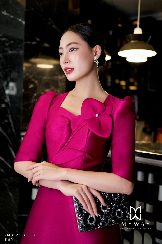 Đầm xoè dáng A-line, cổ biến kiểu, chiều dài qua bắp. Mẫu đầm magenta có túi, có lót, họa tiết hoa 3D đính trước ngực trên nền Taffeta bóng bẩy, trơn mịn. Tinh tế cùng tay lỡ và dáng trên ôm dưới xoè khéo léo che khuyết điểm vòng 2 cho người mặc.