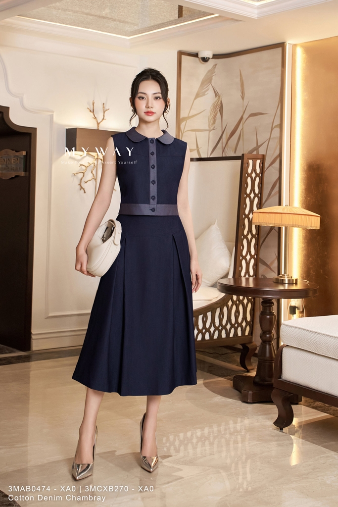 Chân váy xoè xếp ly, dài qua bắp, Có lót, Tinh tế với tông xanh navy cùng điểm nhấn cạp cao cá tính và chất liệu vải Cotton Denim Chambray trơn, có độ thấm hút mồ hôi tốt, thoáng mát vào dịp Hè. Thiết kế thời thượng, giữ phom chuẩn chỉnh, dễ mặc, dễ phối, phù hợp mọi phong cách dịp Xuân - Hè, tôn dáng cho phái đẹp.