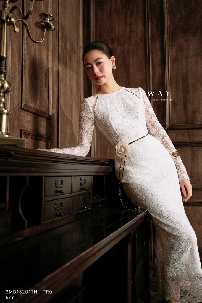 Đầm ôm body cổ thuyền, có chiều dài qua bắp. Tinh tế cùng kiểu dáng dài tay thanh lịch kết hợp chất liệu ren dệt kim tuyến nhập khẩu cao cấp, mềm mại co giãn tốt, thấm hút mát mẻ. Điểm nhấn là phần họa tiết vải dệt hoa lá kết hợp cùng thắt lưng kim loại và hoa cài vô cùng nữ tính sang trọng, mang lại sự thoải mái cho thượng khách, toát lên vẻ thanh lịch, phong cách hiện đại, sang trọng, khả năng phối đồ cao, để nàng nổi bật trong mọi đêm tiệc xa hoa.