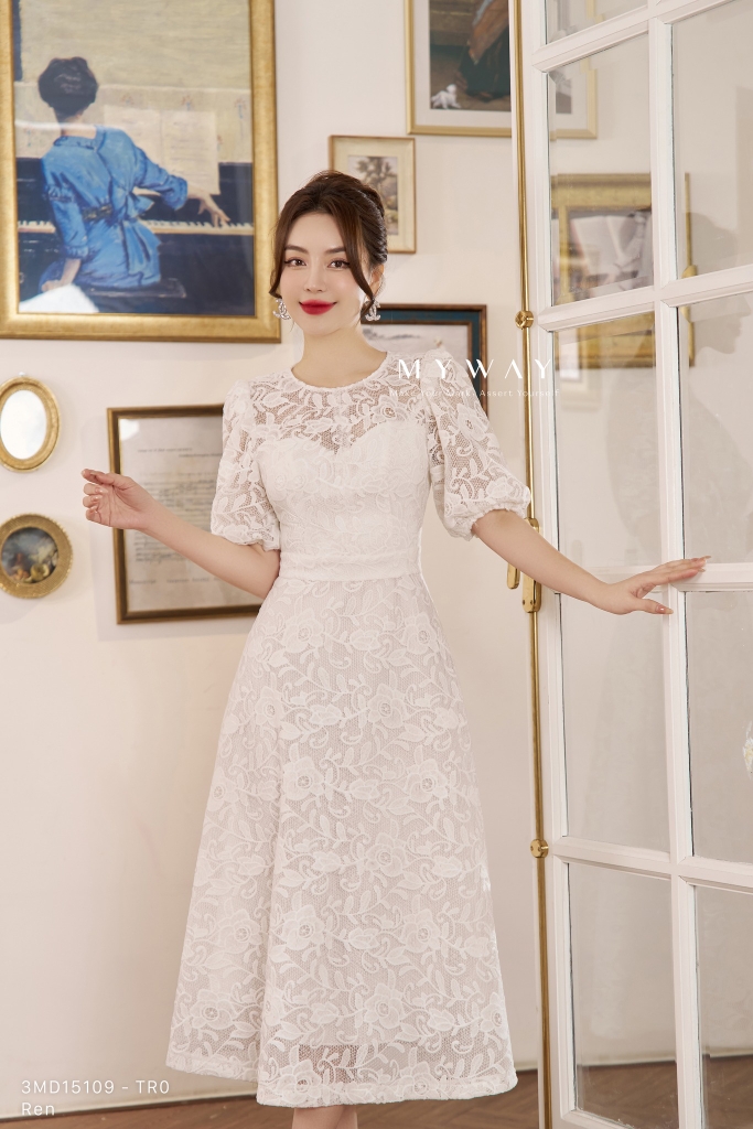 Thiết kế: Đầm xòe, có độ dài ngang bắp, có lót để thoải mái khi mặc. Thiết kế tinh tế với cổ tròn thanh lịch, cùng họa tiết ren hoa tinh tế mang lại cảm giác sang trọng, nữ tính.