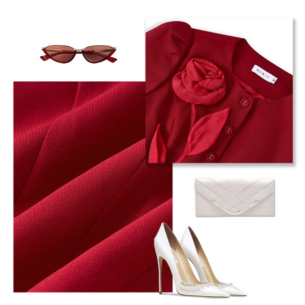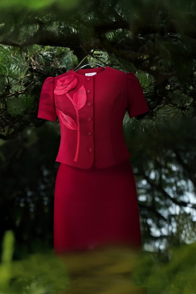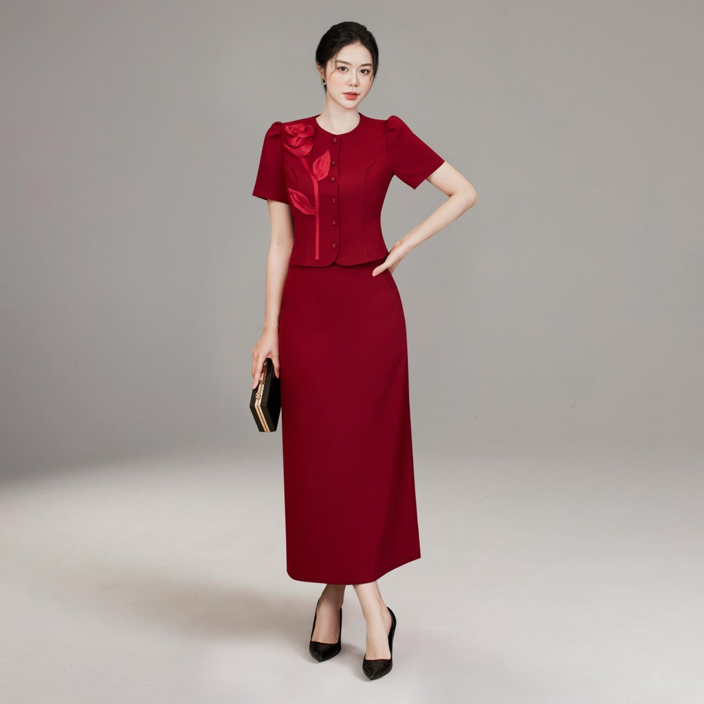Áo kiểu suông ôm cổ tròn, dài ngang hông. Thiết kế tay ngắn thanh lịch cùng điểm nhấn đính hoa 3D trước ngực tạo nét duyên dáng trên nền đỏ tươi mới, trở thành điểm nhấn cho người mặc.