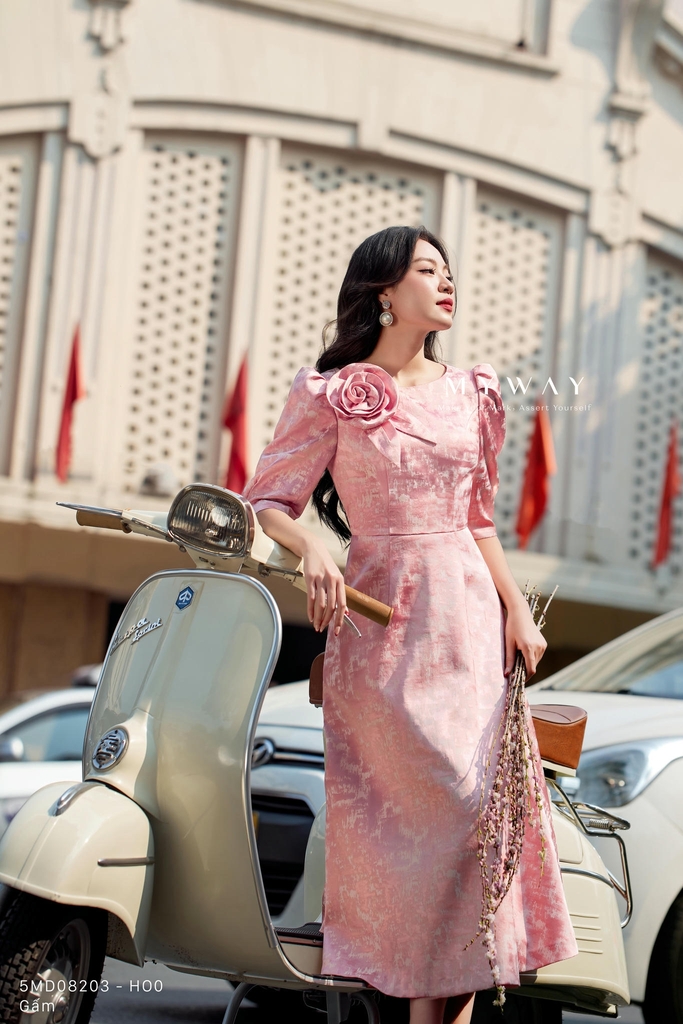 Đầm xòe rủ cổ thuyền, có chiều dài ngang bắp. Tinh tế cùng chi tiết tay lỡ, có khóa sau, có lót và họa tiết hoa chìm trên nền vải Gấm thời thượng mang lại cảm giác hiện đại, trẻ trung. Đầm dáng xòe rủ, chiết eo giúp tôn dáng vòng 2 và khuyết điểm vòng 3 khéo léo. Sở hữu sắc hồng phấn trang nhã, cùng điểm nhấn đính hoa 3D sang trọng để nàng nổi bật trong mọi đêm tiệc xa hoa.