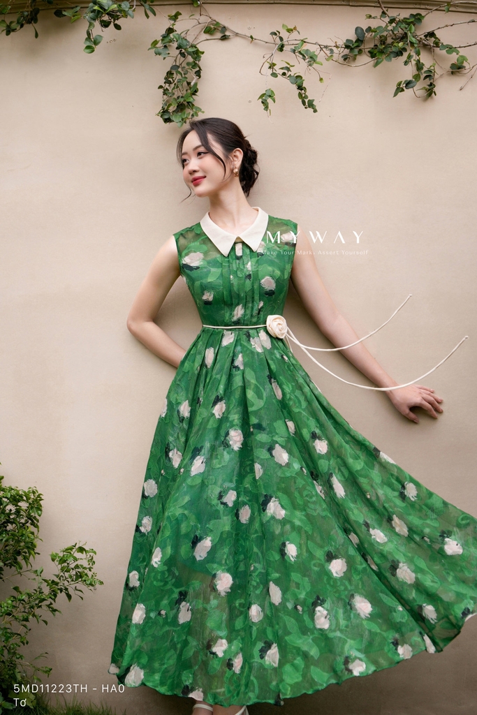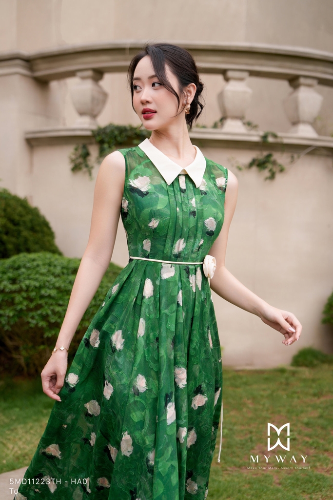 Đầm xòe xếp ly không tay, cổ Đức, không túi, có lót, dài qua bắp. Tinh tế với họa tiết hoa nhí nở rộ trên nền vải Tơ xanh thanh lịch mang lại cảm giác hiện đại, trẻ trung. Đầm dáng chiết eo, kèm phụ kiện đai hoa giúp vòng 2 nhỏ gọn thanh mảnh, cùng dáng xòe bay bổng để thiết kế ứng dụng trở nên nhẹ nhàng, duyên dáng.