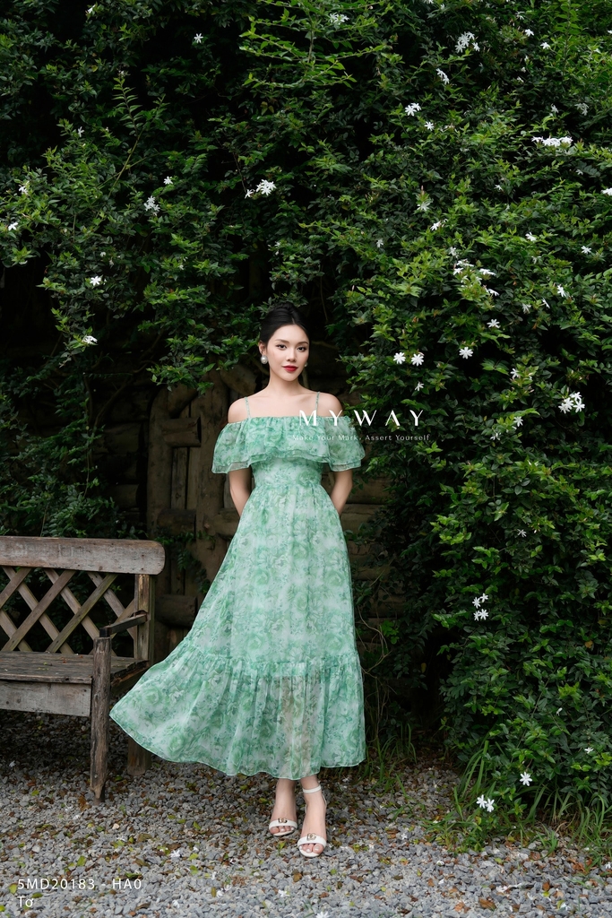 Thiết kế đầm maxi có độ xòe rủ, dài qua bắp, có lót. Tinh tế cùng thiết kế 2 dây trễ vai quyến rũ, thời thượng, dáng chiết eo giúp vòng 2 nhỏ gọn thanh mảnh. Họa tiết hoa hoa nền xanh mint in trên vải tạo điểm nhấn cho người mặc.