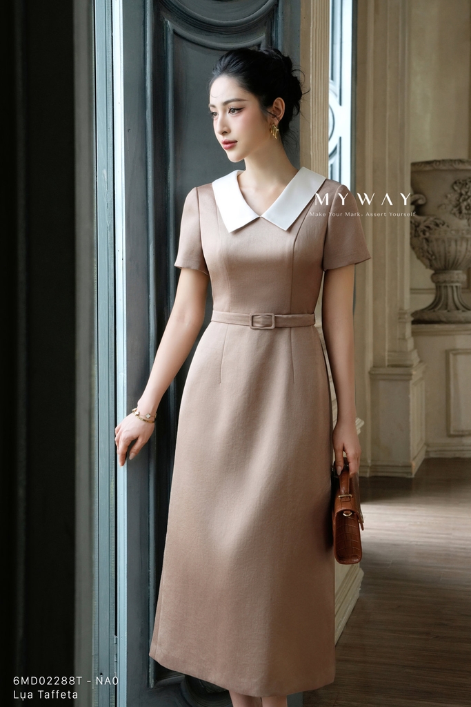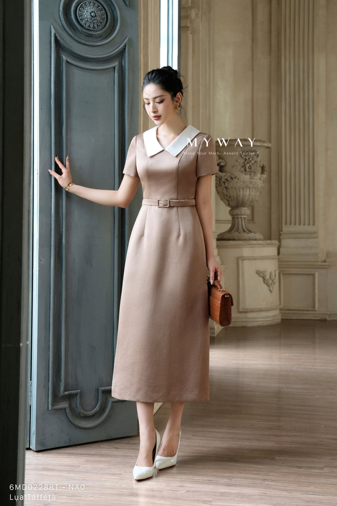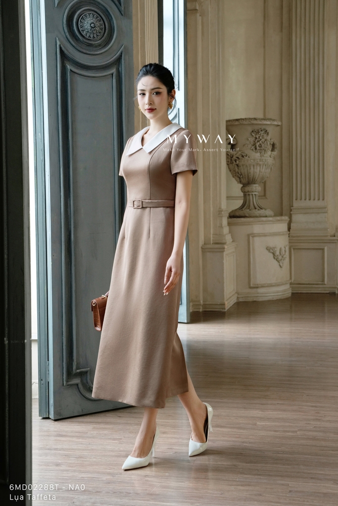 Đầm A ngắn tay, dáng midi, dài qua gối. Tinh tế điển nhấn đai lưng chiết eo thanh mảnh mang lại cảm giác hiện đại, trẻ trung. Đầm ôm A mang tone nâu thời thượng kết hợp cổ sơ mi màu trắng trang nhã trên nền vải có độ óng nhẹ, toát lên vẻ thanh lịch, phong cách hiện đại, khả năng phối đồ cao.