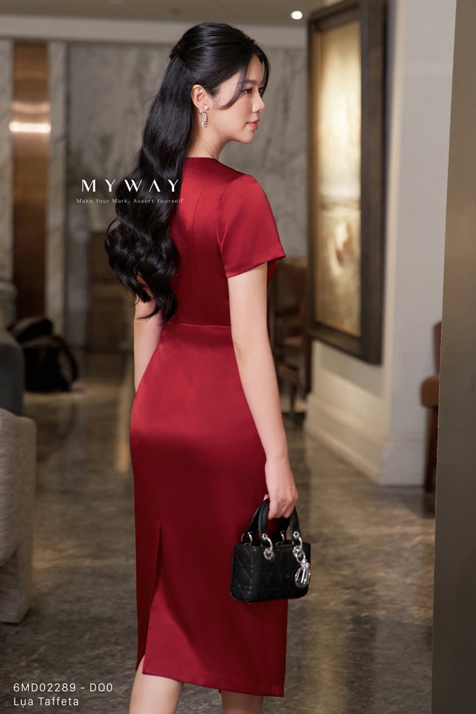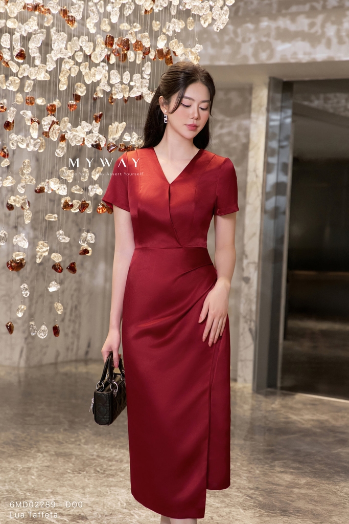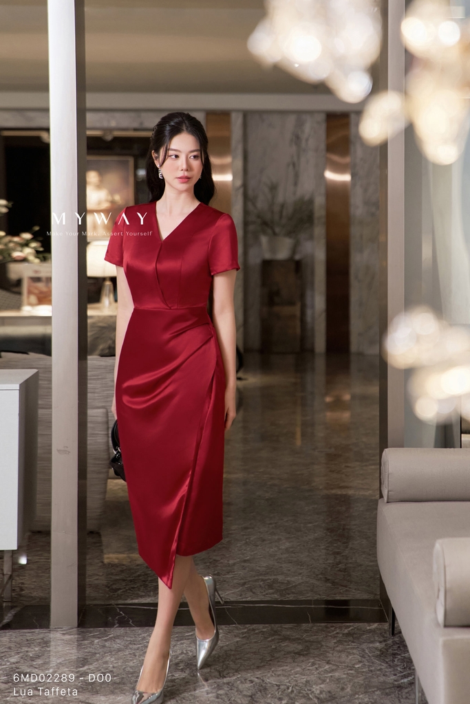 Đầm ôm nhẹ, cổ tim, tay ngắn, dài qua bắp chân. Có lót, không túi. Màu đỏ trang nhã, nổi bật với kết cấu chất liệu lụa Taffeta nhập khẩu cao cấp, giữ phom chuẩn, bề mặt bóng nhẹ sang trọng.Thiết kế tôn dáng, dễ mặc, mang lại vẻ thanh lịch, hiện đại. Phù hợp nhiều dịp, dễ phối phụ kiện.