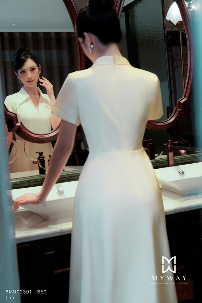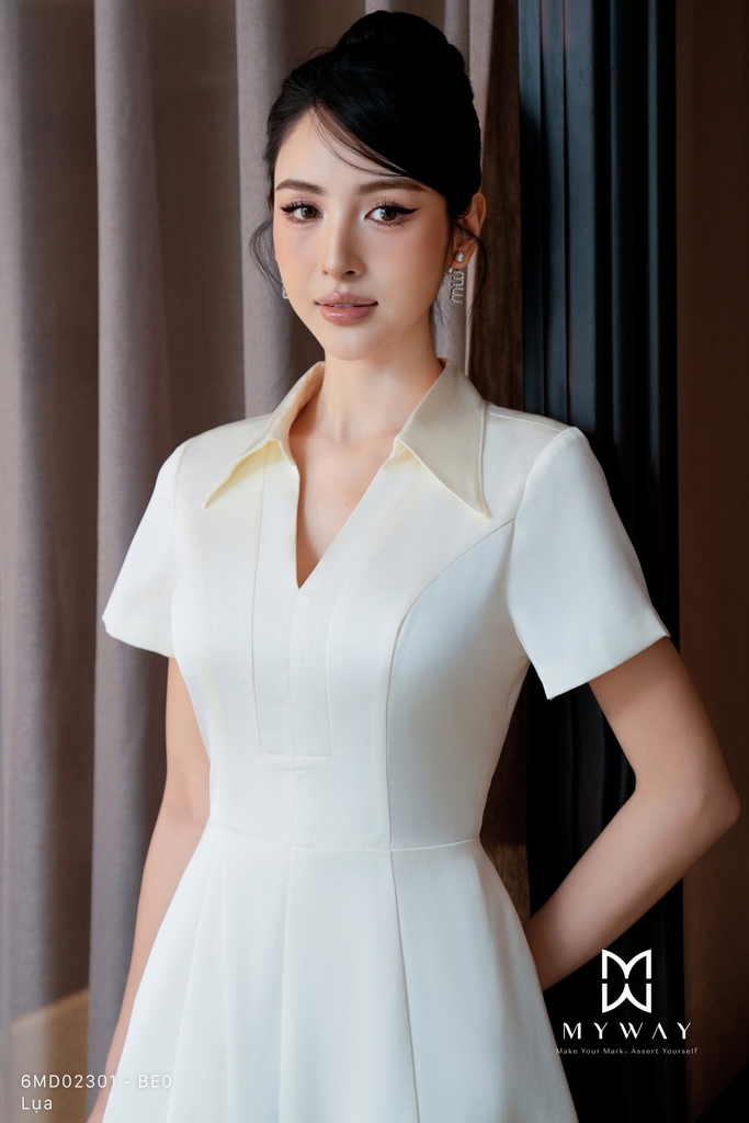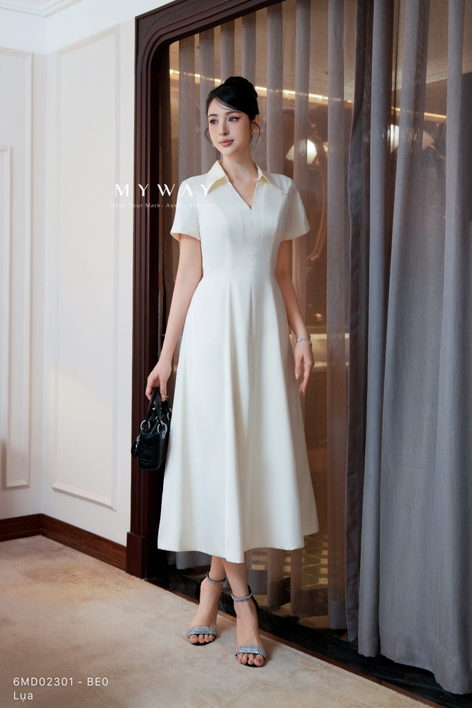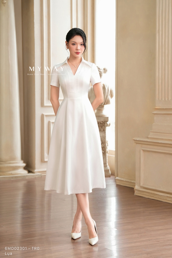 Đầm xòe trắng với họa tiết kẻ chìm nhẹ nhàng, được thiết kế từ chất liệu lụa nhập khẩu cao cấp, mang đến cảm giác mềm mại, thoáng mát và tôn dáng. Dáng đầm xòe nhẹ, dài ngang bắp chân, tay ngắn, có lót bên trong giúp tạo phom chuẩn chỉnh và giữ sự kín đáo. Điểm nhấn nằm ở phần cổ áo cách điệu và họa tiết vải tinh tế, toát lên vẻ thanh lịch, hiện đại. Thiết kế phù hợp cho nhiều dịp, dễ phối đồ và mang lại sự thoải mái tối đa cho người mặc.