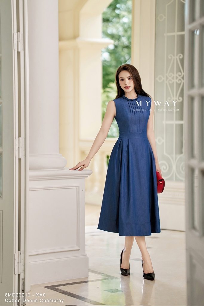 Đầm xòe không tay, dáng midi, có túi, có lót. Tinh tế dùng kiểu dáng chiết eo tinh tế mang lại cảm giác hiện đại, trẻ trung. Đầm cổ bèo cùng điểm nhấn xếp ly ngực, sở hữu sắc xanh navy phù hợp mọi hoạt động trong ngày.