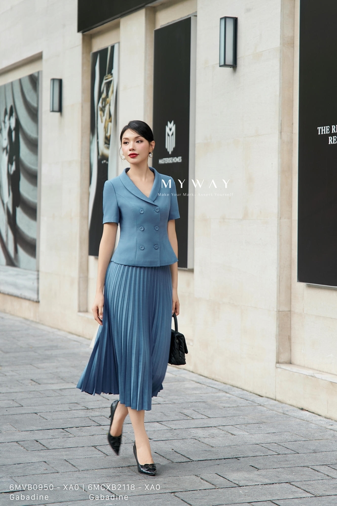 Áo vest kiểu cổ tim, dài ngang hông. Tinh tế cùng dáng chiết eo thanh lịch. Mẫu áo ngắn tay có lót, không túi với tone màu xanh tôn da tạo điểm nhấn cho người mặc.