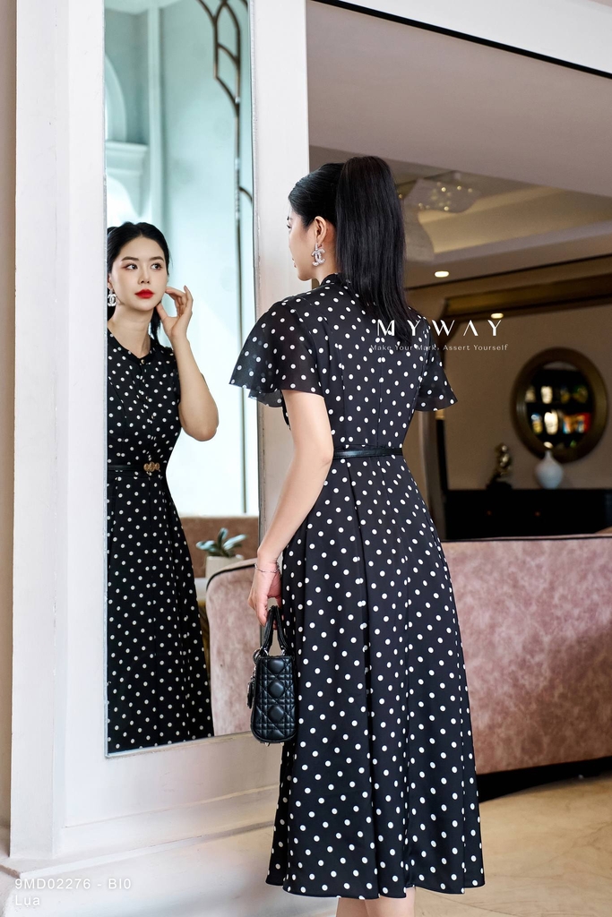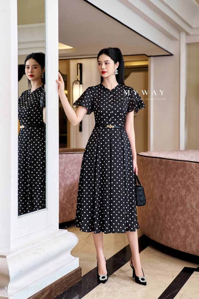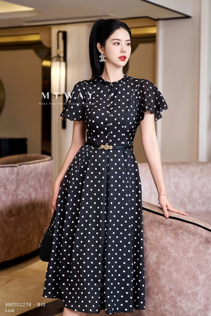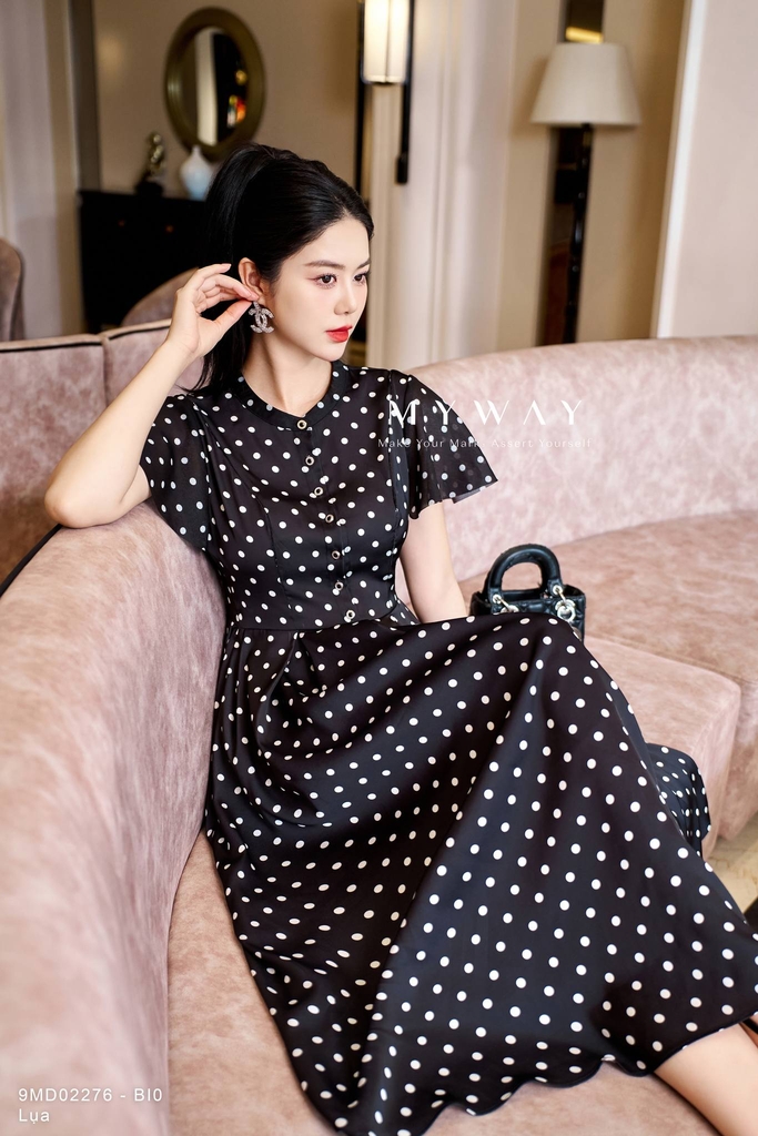 Outlet | Đầm sơ mi cổ tàu họa tiết chấm bi