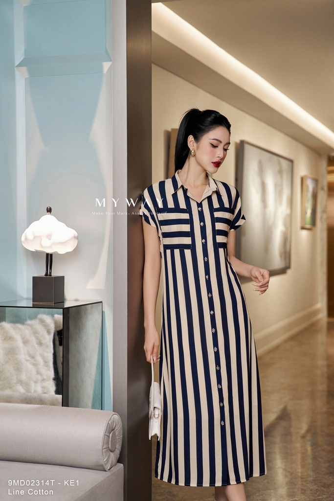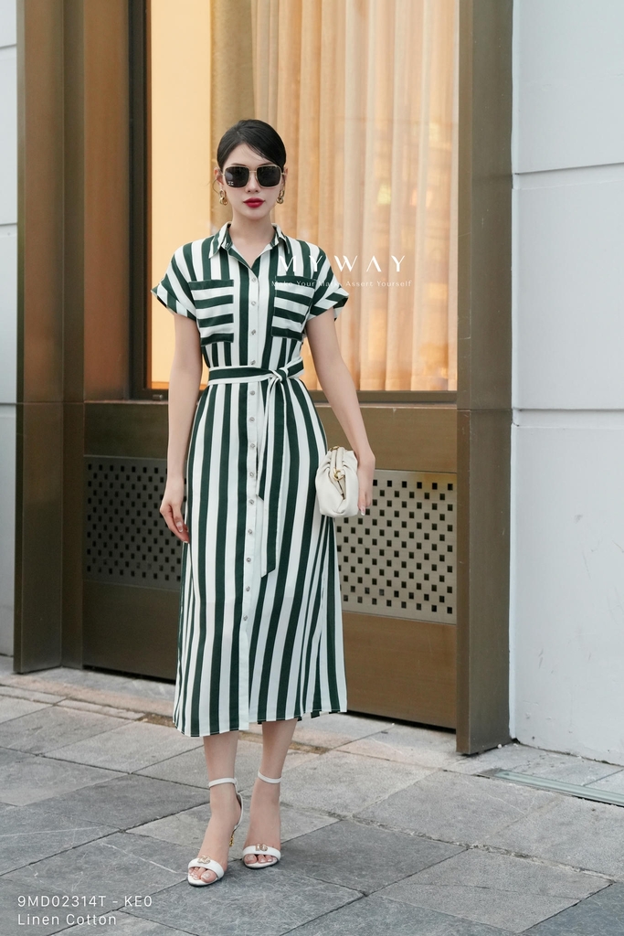 Đầm sơ mi suông vừa, ngắn tay tay, dáng midi, có túi, có lót. Tinh tế với họa tiết kẻ sọc và ngang kết hợp mang lại cảm giác hiện đại, trẻ trung. Thiết kế thoải mái, thanh lịch với điểm nhấn đai lưng cùng tông màu giúp vòng 2 nhỏ gọn thanh mảnh.