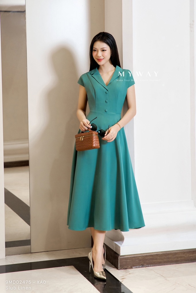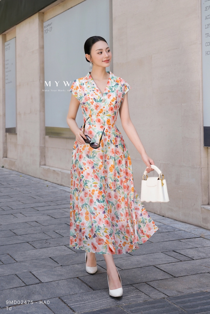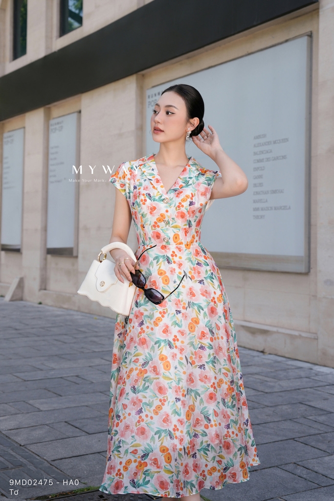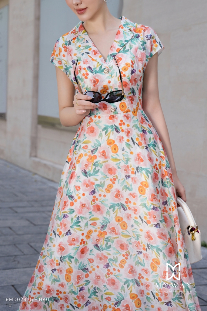 Đầm xòe trên ôm dưới xòe với 2 ve biến kiểu, dài qua bắp chân, vai chờm, khóa sau, có túi và lót bên trong. Đầm có nhiều màu và họa tiết đa dạng gồm họa tiết hoa trên vải tơ, chấm bi trắng trên nền đen, cùng họa tiết hỗn hợp hoa sắc màu với tông nâu be và đen be trên vải lụa nhập khẩu cao cấp. Chất liệu đã qua xử lý giúp giữ form dáng quyến rũ, hiện đại. Thiết kế dễ mặc, che khuyết điểm cơ thể và họa tiết in sắc nét mang lại vẻ thanh lịch, phong cách hiện đại cùng sự thoải mái tối ưu.