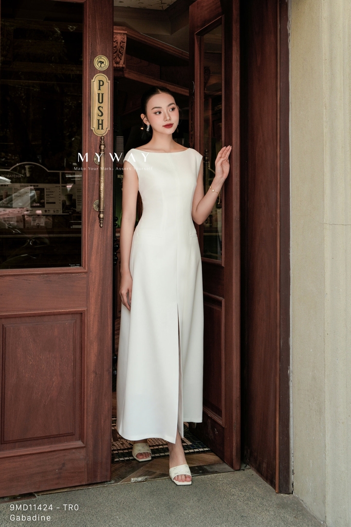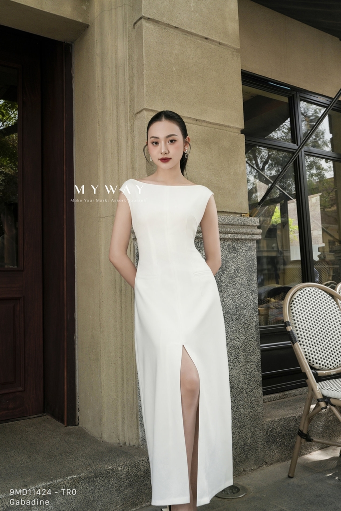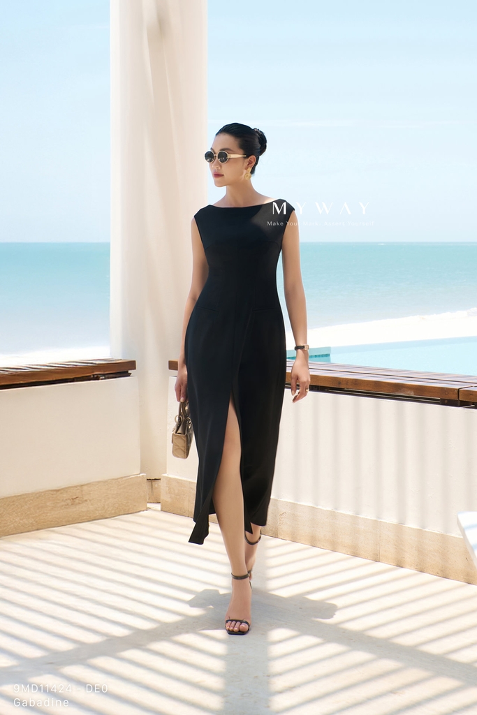 Đầm xoè dáng trên ôm, dưới xoè, cổ biến kiểu, có chiều dài qua bắp. Thiết kế không tay trẻ trung, không túi, có lót, A cổ lọ. Thiết kế mang tông đen/ trắng sành điệu, kết hợp chi tiết xẻ trước quyến rũ mang lại cảm giác hiện đại, trẻ trung. Dáng chiết eo giúp vòng 2 nhỏ gọn thanh mảnh kết hợp vải Gabadine ít nhăn, phóng khoáng để nàng nổi bật khi xuất hiện bất cứ đâu.