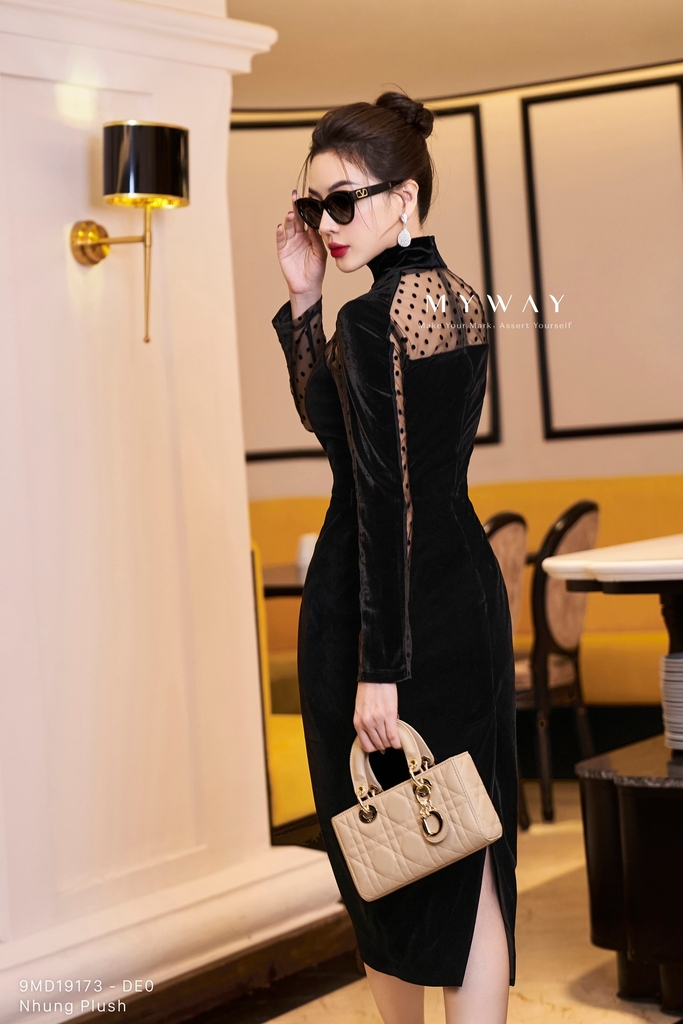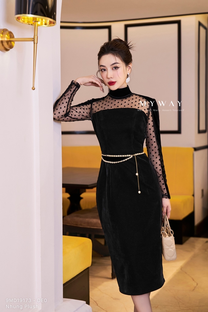 Thiết kế: Đầm ôm, dài ngang bắp, có lót để thoải mái khi mặc. Tinh tế cùng cổ lọ , chất liệu nhung phối vải lưới họa tiết chấm bi nổi bật mang lại vẻ đẹp trẻ trung, thời thượng cho người mặc. Đầm dáng ôm body, tay dài giúp tôn lên vẻ đẹp cơ thể hiệu quả. Kết hợp với gam màu đen tinh tế, thời thượng giúp quý cô tự tin cuốn hút trong đám đông.
