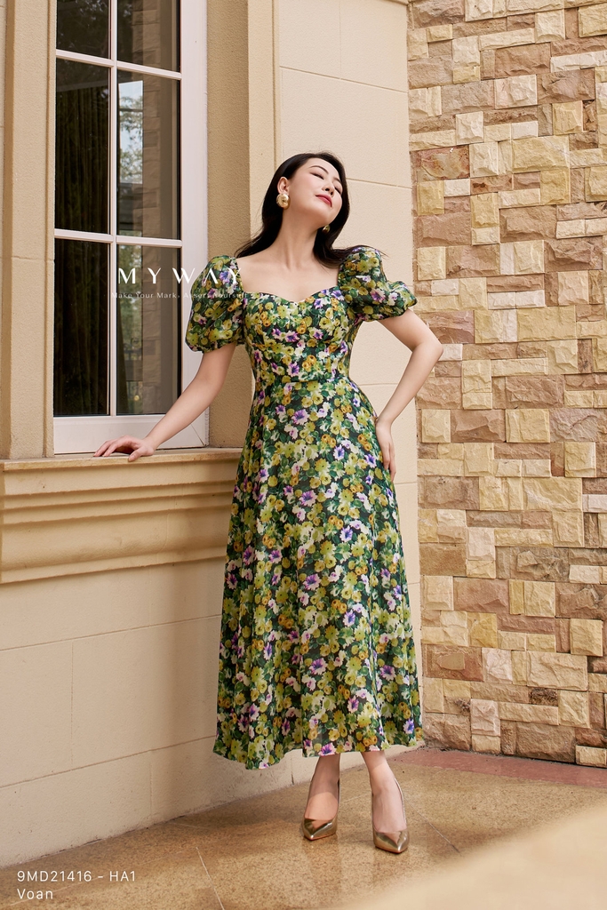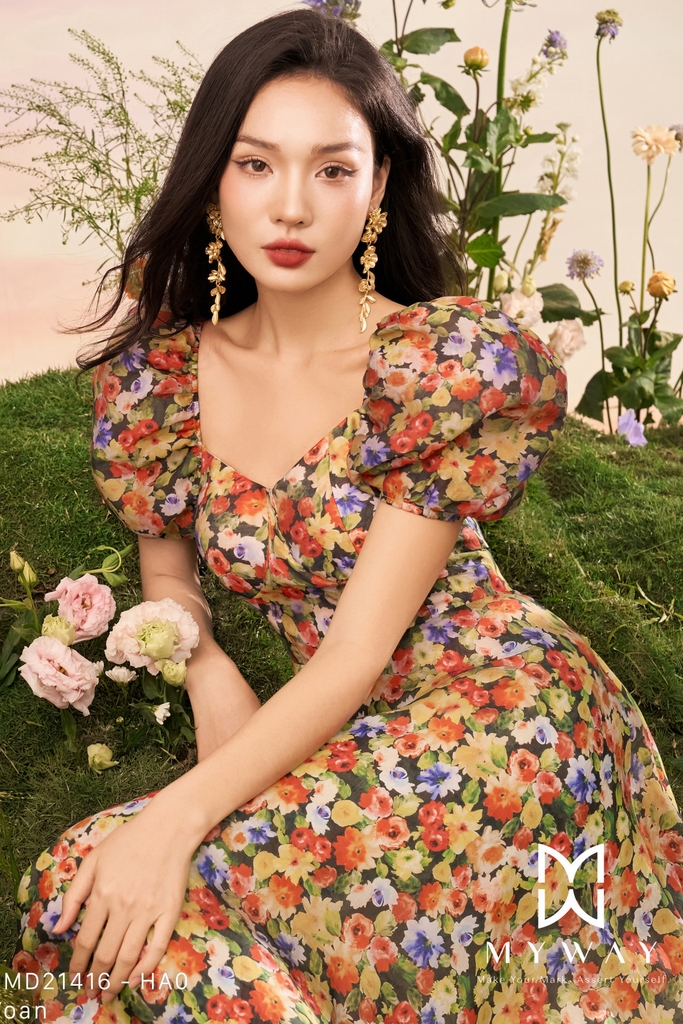 Đầm xòe cổ vuông, dài trên mắt cá chân, ngắn tay, có lót. Thiết kế mang tông cam tươi mới cùng hoạ tiết hoa nhí sống động trên nền chất liệu Voan bay bổng, thoáng mát, mang lại cảm giác hiện đại, trẻ trung. Đầm dáng chiết eo giúp vòng 2 nhỏ gọn thanh mảnh, tay bồng tinh tế tạo điểm nhấn cho người mặc để nàng nổi bật khi xuất hiện bất cứ đâu.
