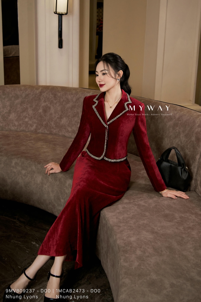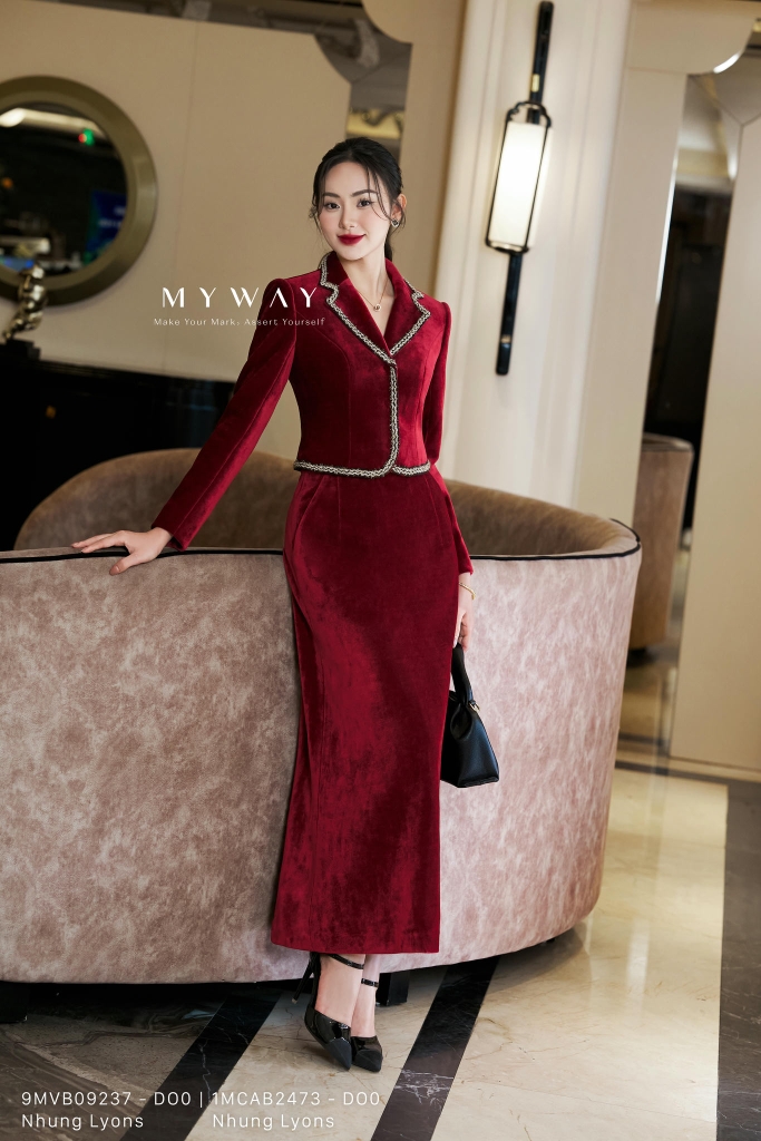 Áo vest ôm, cổ 2 ve, dài ngang hông. Thiết kế tay dài, Có lót, tinh tế với chi tiết viền kim tuyến sang trọng. Được thiết kế từ chất liệu Nhung nhập khẩu cao cấp đã qua xử lý, có đệm/ken vai và tạo form dáng quyến rũ, hiện đại. Điểm nhấn là dây trang trí ốp quanh cổ, nẹp và gấu áo, phom ôm vừa năng động trẻ trung lại che khuyết điểm tốt, Mang lại sự thoải mái cho thượng khách, toát lên vẻ thanh tao, phong cách hiện đại, khả năng phối đồ cao.