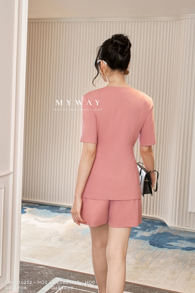 Áo vest ngắn tay, cổ tròn, suông ôm, dài ngang mông, Thiết kế có đệm vai giúp đứng phom và tạo tính chuyên nghiệp, thanh lịch cho bản phối công sở. Tinh tế cùng khuy áo dọc thân và cut-out vạt áo, cùng tông màu trắng, hồng tôn da cho người mặc.