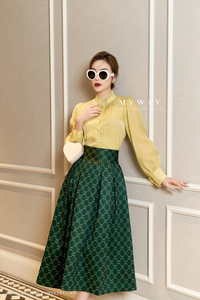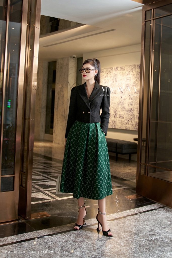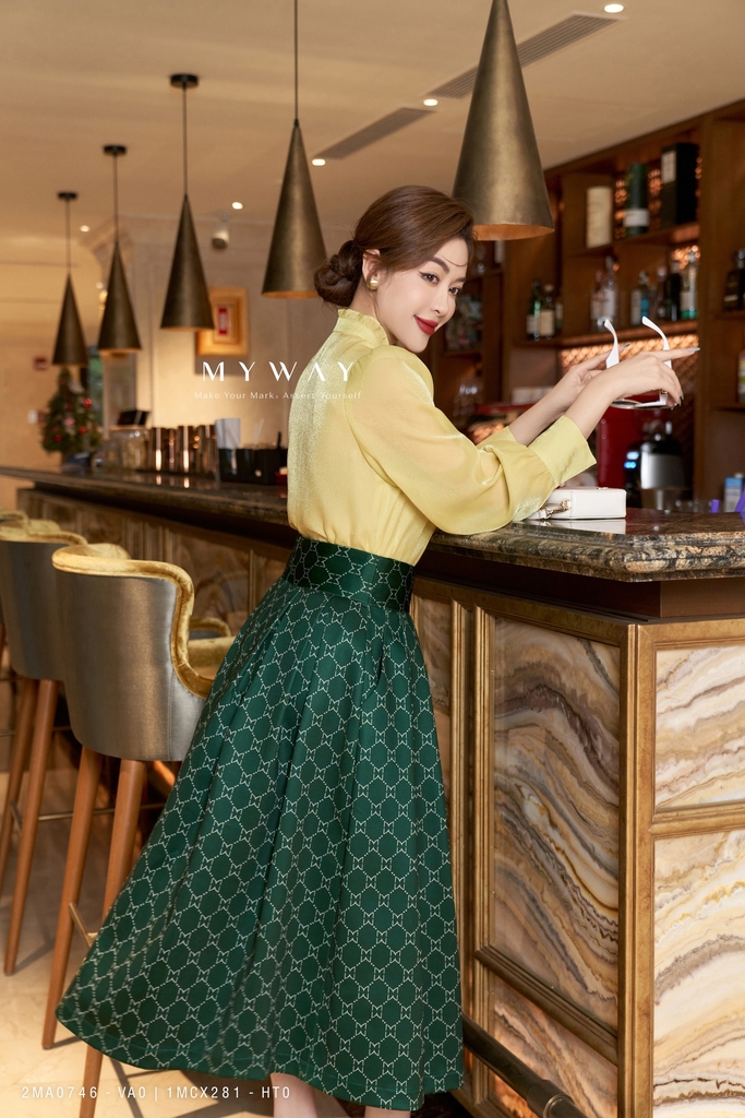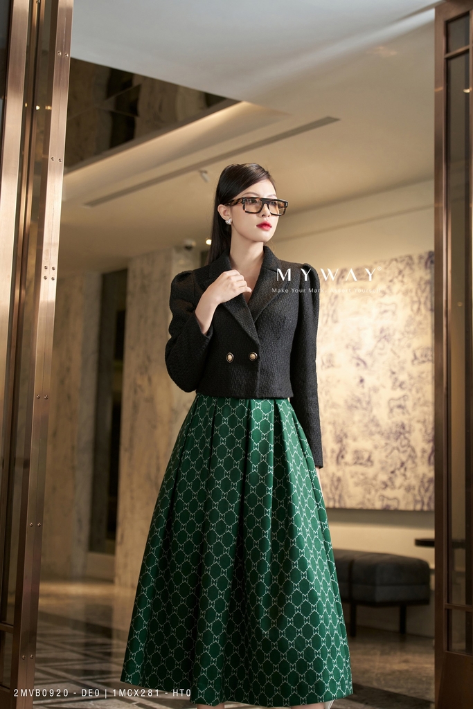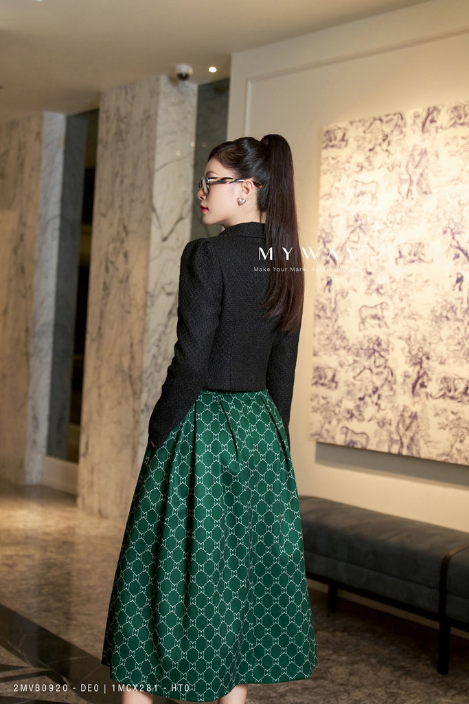Thiết kế: Chân váy xòe xếp ly, có lót để thoải mái khi mặc. Mẫu chân váy xòe dài qua bắp, nổi bật với họa tiết in logo thương hiệu My Way độc đáo cùng với gam màu xanh lục mới mẻ vô cùng thời thượng. Thiết kế xòe xếp ly kiêu sa uyển chuyển giúp che khuyết điểm cơ thể hiệu quả giúp Quý cô có thể biến hoá hoặc kết hợp một cách khéo léo để sở hữu ngay phong cách thanh lịch theo tiêu chuẩn công sở hay kiểu váy trẻ trung, năng động đi dạo phố.